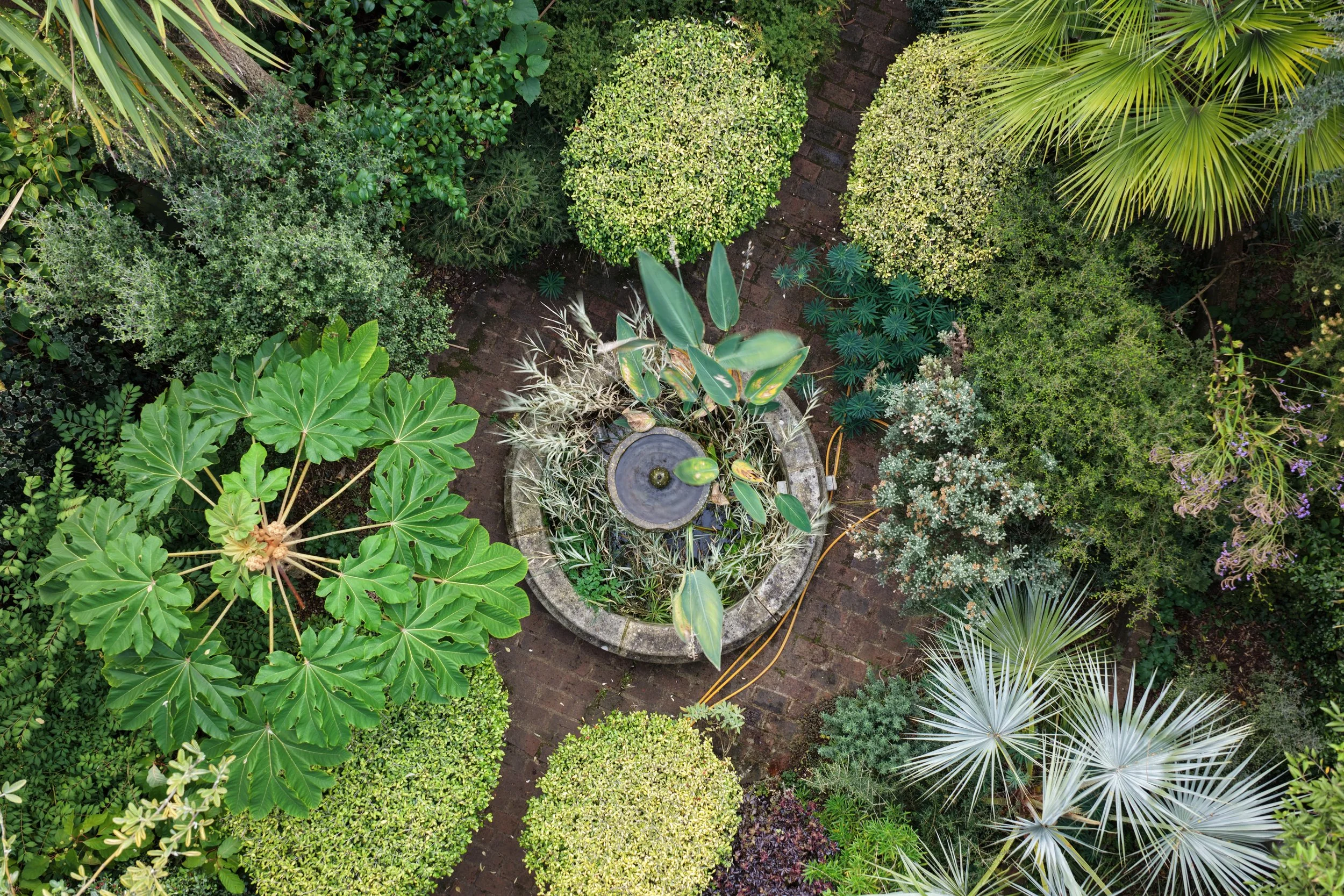 Aerial view of the central fountain in Mona’s Garden, framed by a rich tapestry of contrasting foliage, textures and forms that define her award-winning design.