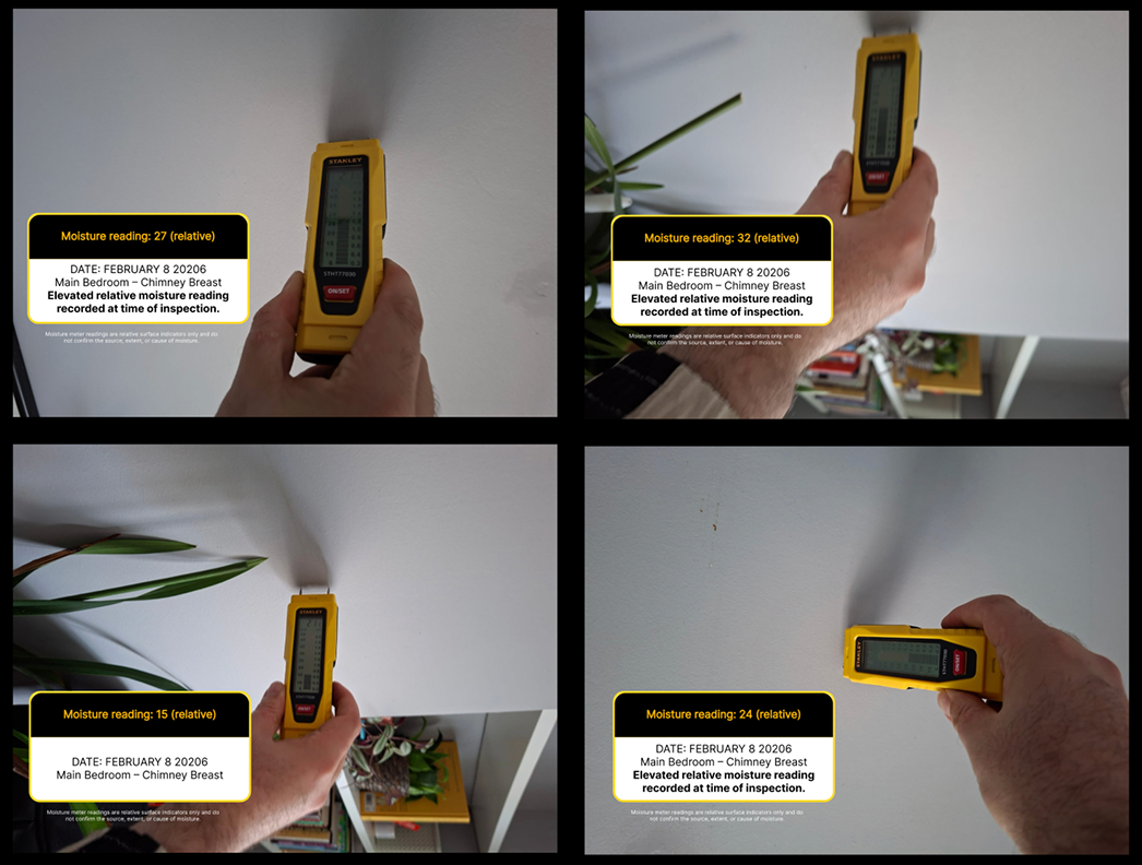 Elevated internal moisture readings were recorded, supporting the presence of damp within the affected areas. These results align with the external defects identified via drone inspection.