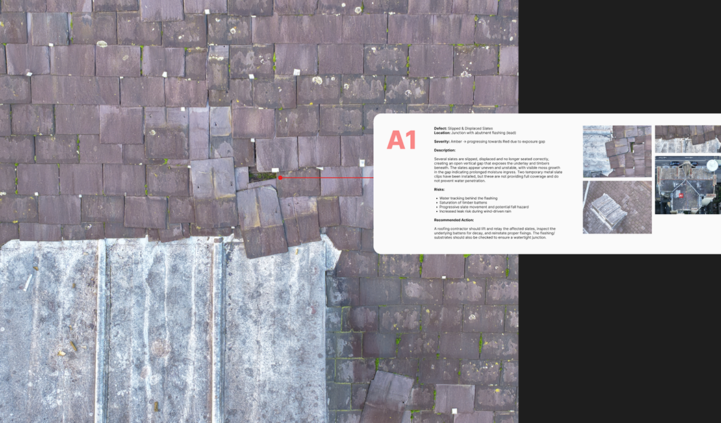 Where internal access is available, internal roof-space images may also be included to support the external findings.